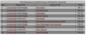 Kemudian peserta dengan nilai tertinggi untuk kategori Soshum berasal dari jurusan akuntansi di Universitas Gajah Mada (UGM) dengan nilai sebesar 786,17, disusul kedua berasal dari jurusan Ilmu Ekonomi Universitas Indonesia (UI) dengan nilai 784,05.